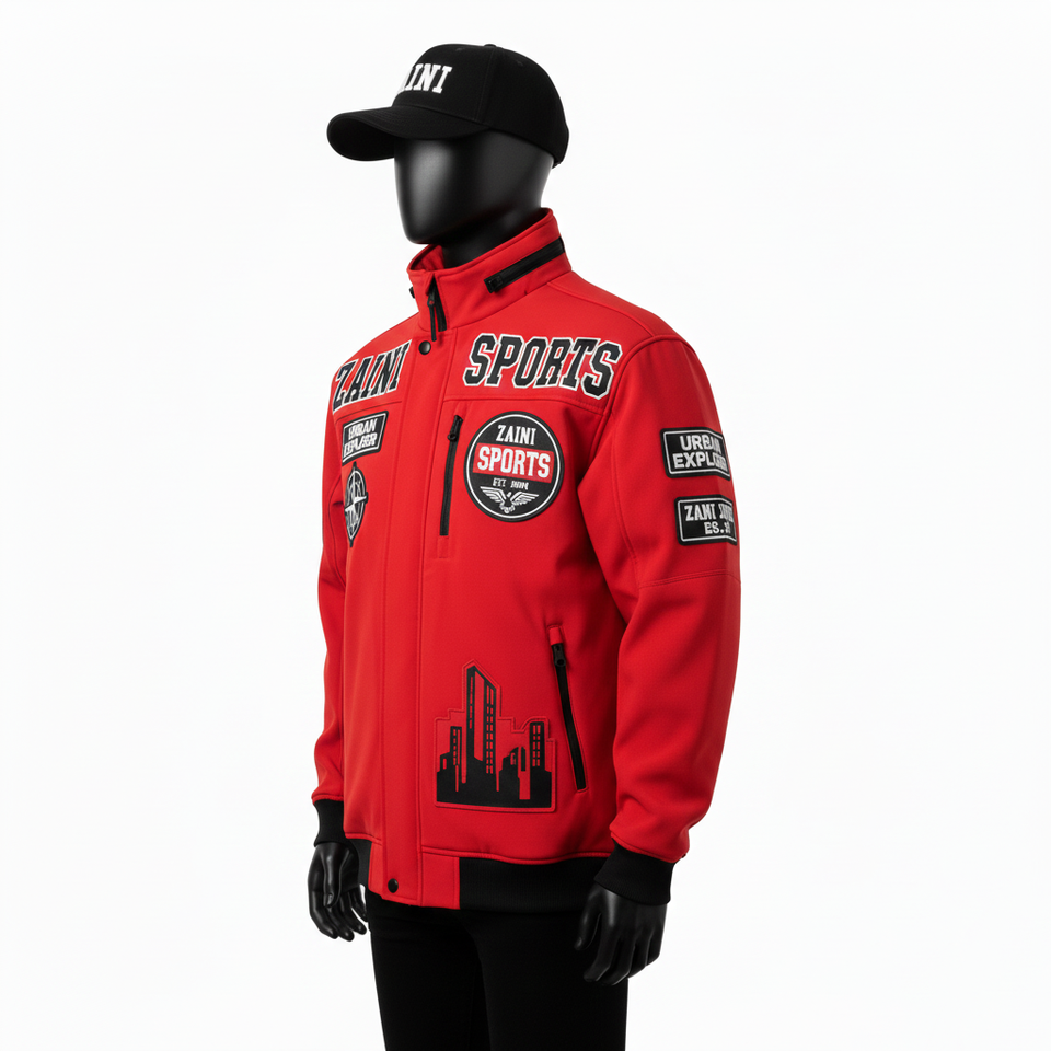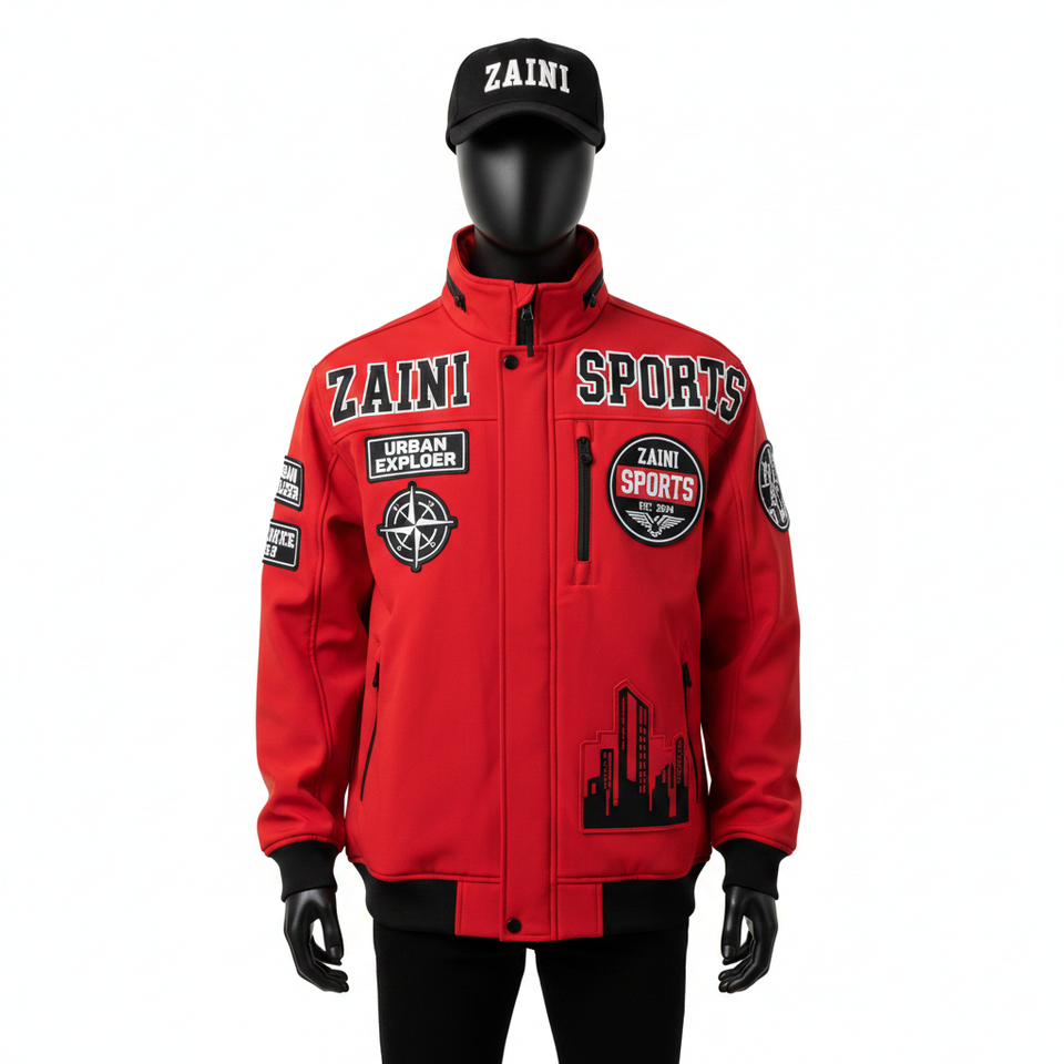 Chaqueta Softshell Resistente al Agua, Tejido Elástico, Paneles Rojos y Negros, Logotipo Personalizado Bordado, Transferencia de Calor, Chaqueta Softshell para Hombre