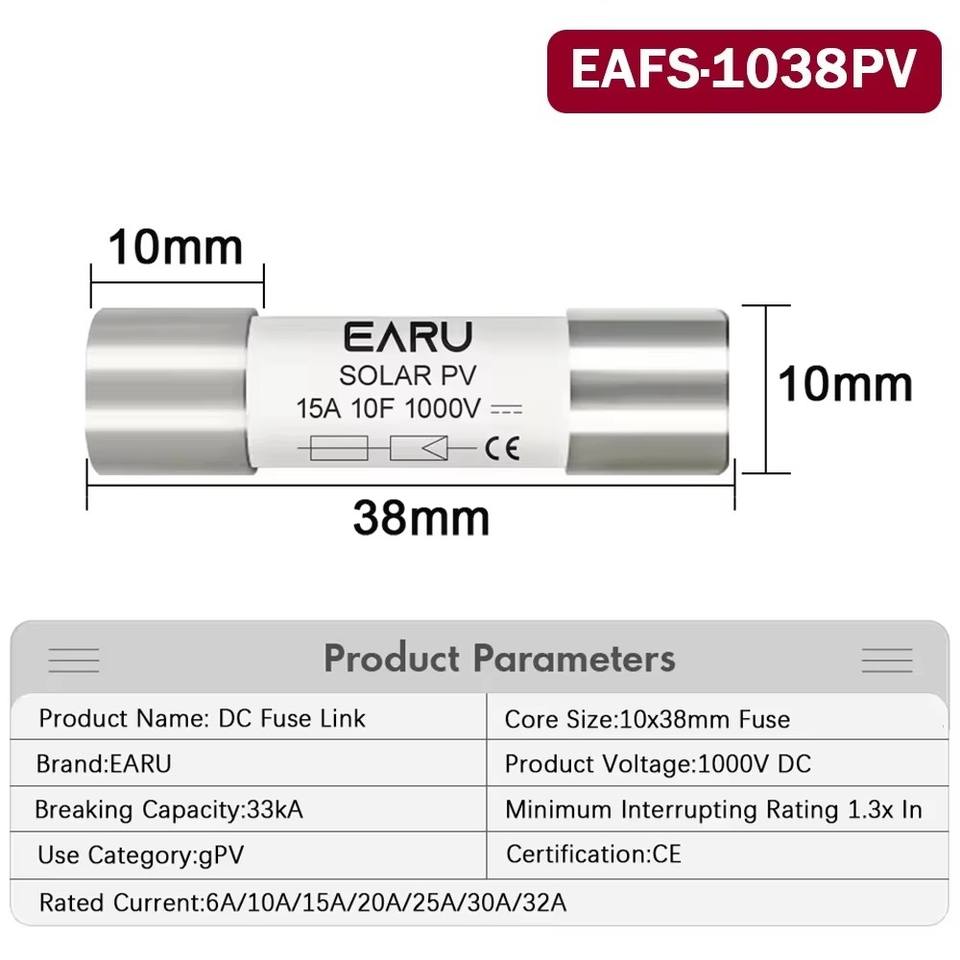 Fusibles Solares de CC de 1000 V, 10 x 38 mm, 33 kA, 6 A, 10 A, 15 A, 20 A, 25 A, 30 A, 32 A, Alto Voltaje para Protección de Sistemas Solares