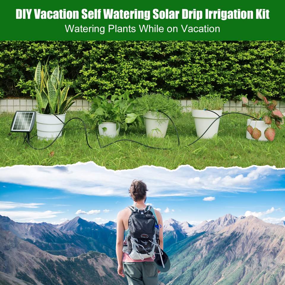 Kit de Riego por Goteo Solar con 2 Métodos de Instalación, Riego Automático para Jardín/Balcón, IP67 y Sin Grifo/Eléctrico