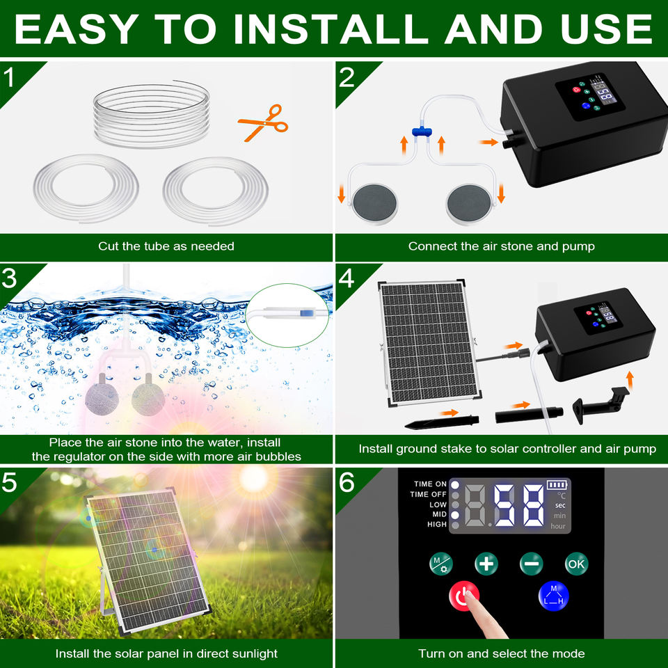 Sistema de Oxígeno Solar de Treinta Vatios con Dos Salidas, Bomba de Aire, Batería de 8800 mAh, Temporizador, Aireación para Hidroponía, Peceras y Estanques