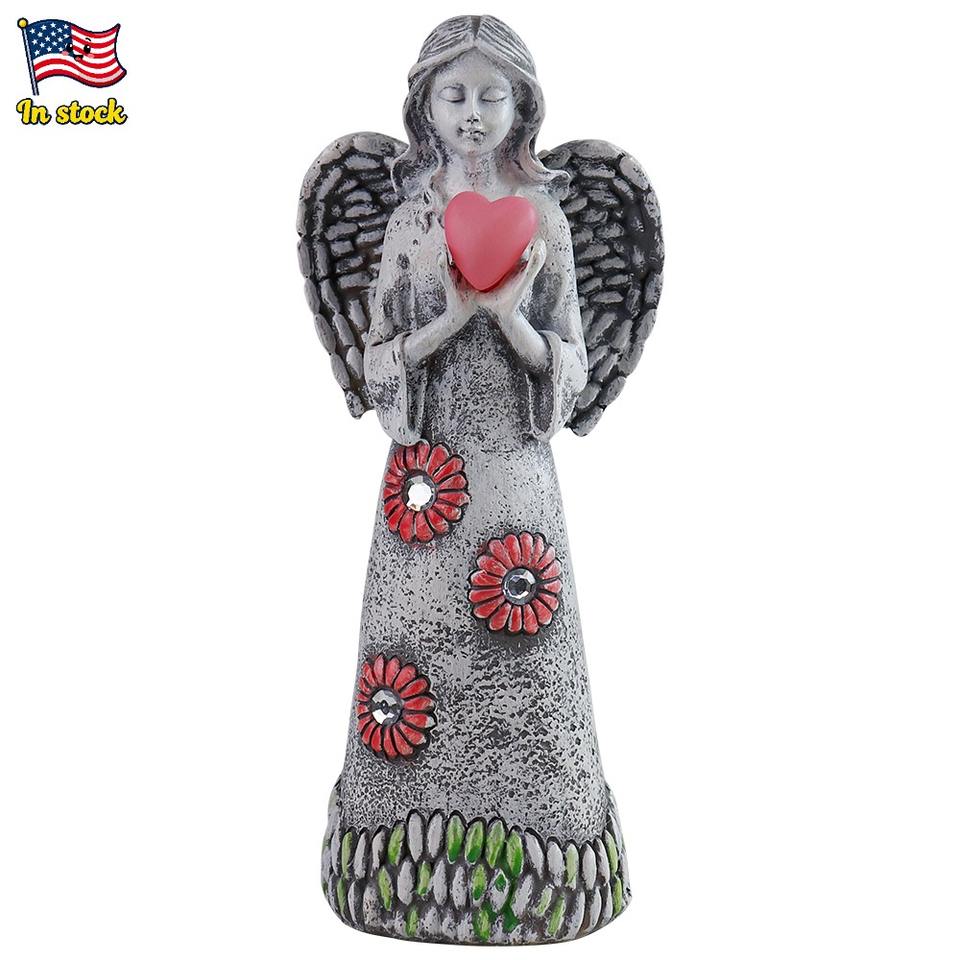 Estatua de ángel con energía solar con corona de flores y luz de corazón, Ángel de resina que sostiene un corazón iluminado para patio o patio