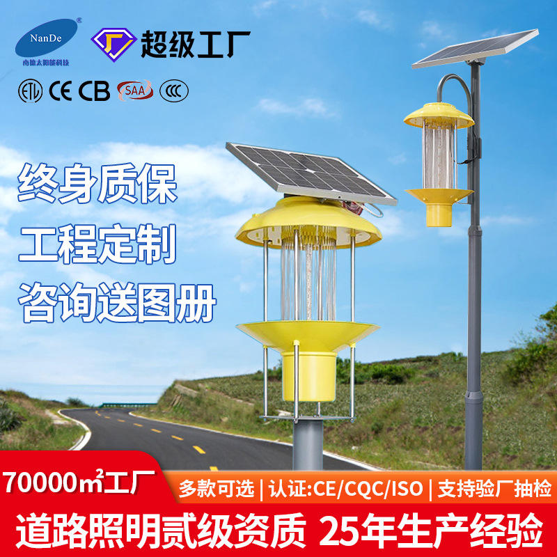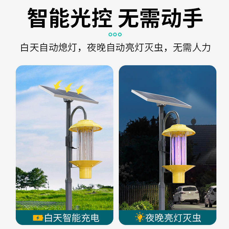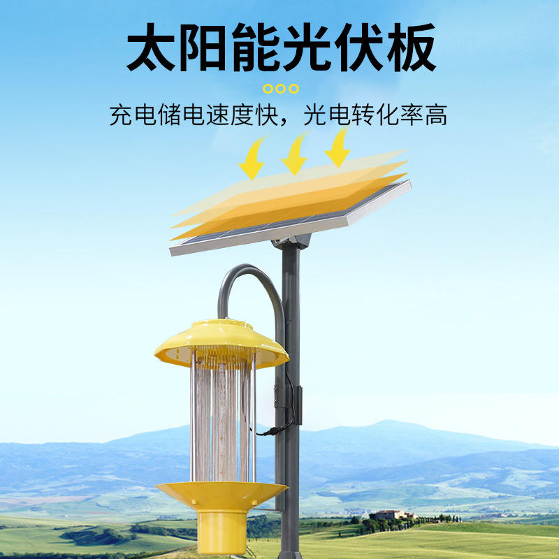 Lámpara insecticida con energía solar, luz LED UV para control de insectos voladores en campos de arroz, huertos y terrenos agrícolas.