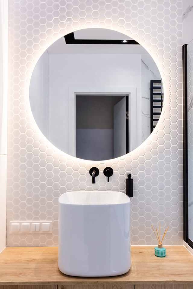 Espejo de Baño de Vidrio con Retroiluminación LED y Energía Solar, Moderno, de Pared, Antivaho, con Calentamiento Rápido, Control Inteligente