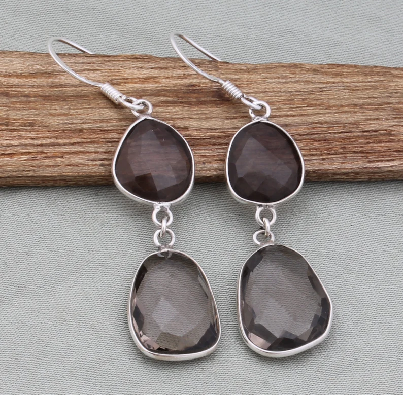 Pendientes de gota hechos a mano de Plata de Ley 925 sólida, conjunto de bisel de piedras preciosas facetadas de cuarzo ahumado para fiestas y bodas