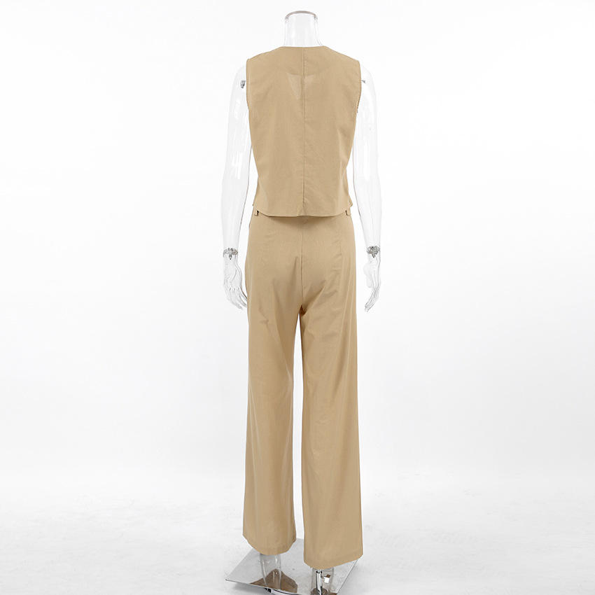 Conjunto de Dos Piezas de Verano para Mujer, Chaleco de Lino y Algodón de Color Sólido con Cuello en V, Conjuntos de Moda