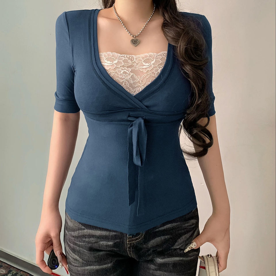 Camiseta de punto transpirable y ecológica de manga corta con encaje de color liso y patchwork floral para mujer, estilo chic, con lazo, minimalista y casual.