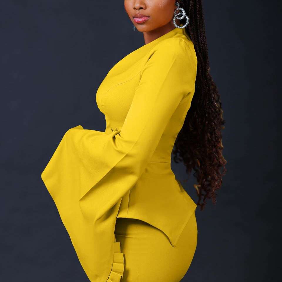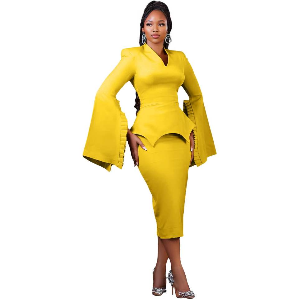 Vestido de moda para mujer con cuello en V, manga amplia con pliegues, color liso y abertura, corte ajustado