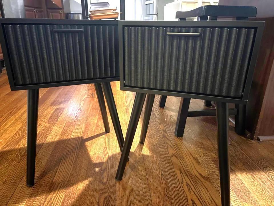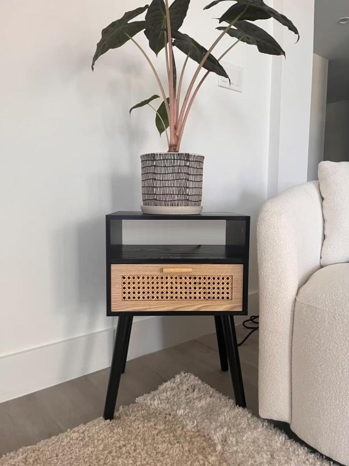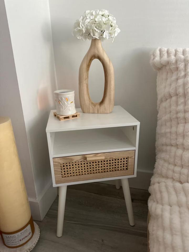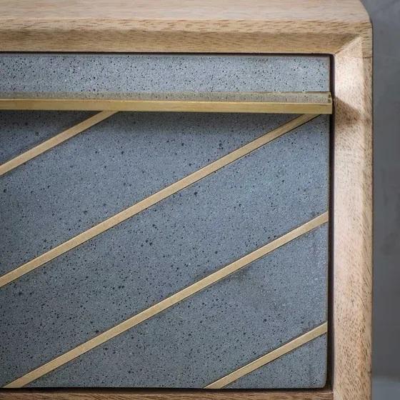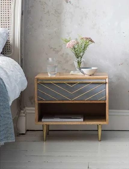 Mesita de noche de madera maciza de mango con cajón de incrustaciones de latón, diseño de almacenamiento elegante, construcción duradera, perfecta para decoración de dormitorio