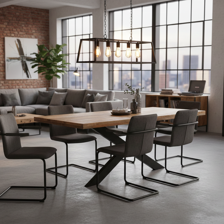 Mesa de Comedor Rectangular Hecha a Mano con Madera de Mango Sólida y Ecológica | Base Metálica Industrial en Forma de Cruz | Comedor de Restaurante Moderno