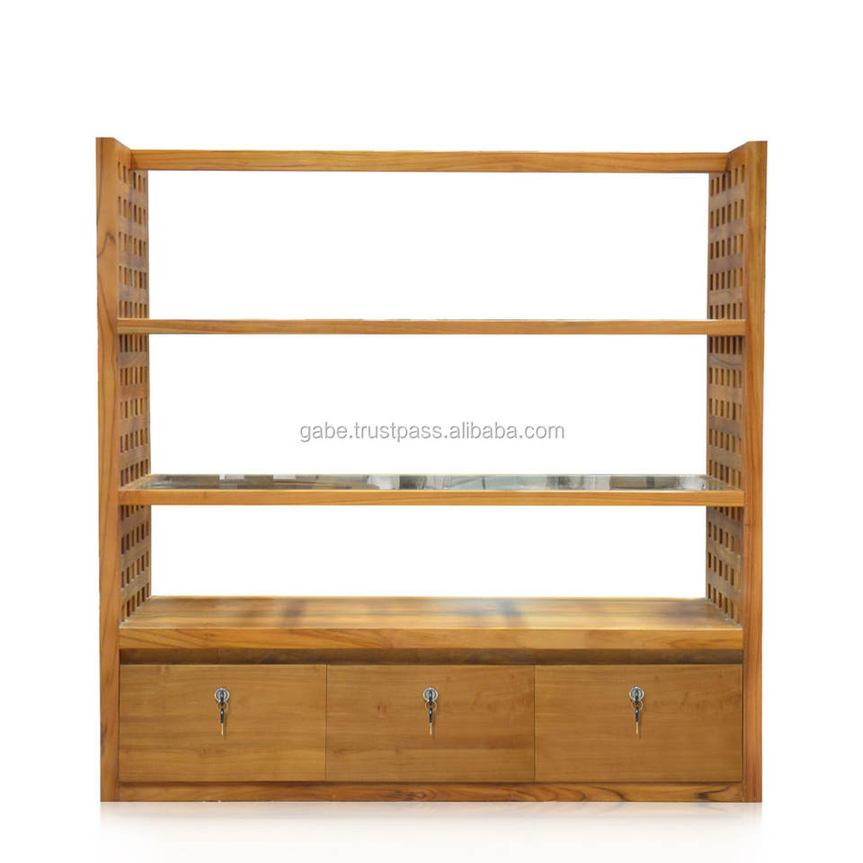 Estante de exhibición de madera de teca natural sólida con 3 cajones Madera de teca natural Premium para tienda para escaparate