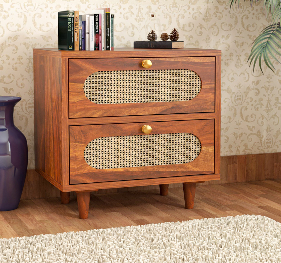 Mesa de Noche de Madera Maciza de Sheesham con 2 Cajones, Acabado Miel, Altura Ajustable, Diseño Clásico Moderno y Lujoso para Dormitorio, Sala de Estar o Comedor
