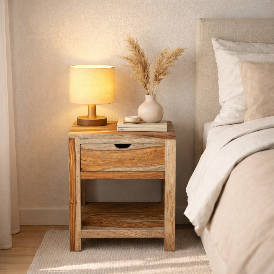 Mesita de Noche de Madera Maciza de Sheesham con Cajón y Estante Abierto | Mesa de Noche de Madera con Acabado Natural | Mesa de Noche Moderna para Dormitorio