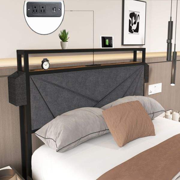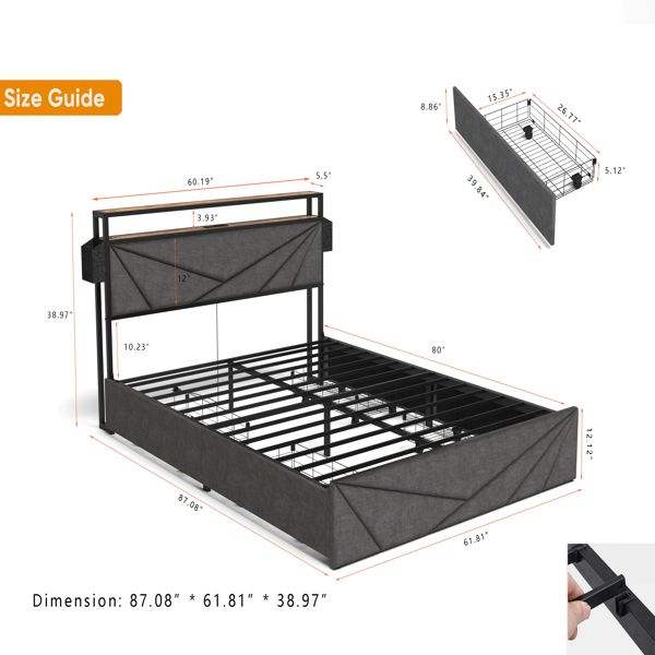 Base de Cama Queen LED Sólida y Estable con Cabecera con Almacenamiento, Estación de Carga, Sin Ruido, No Requiere Somier, Fácil Montaje