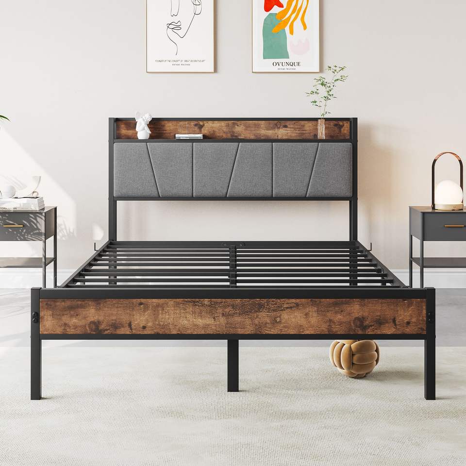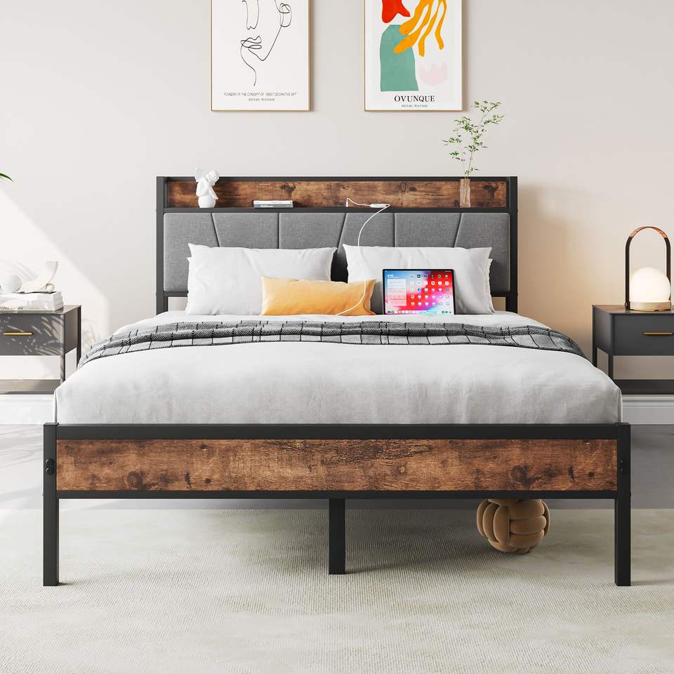 Base de Cama Sólida y Estable, Silenciosa, Tamaño Completo, con Cabecera con Almacenamiento, Estación de Carga, Fácil Montaje, Sin Necesidad de Somier, Camas Tapizadas