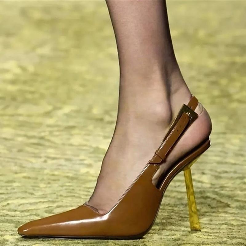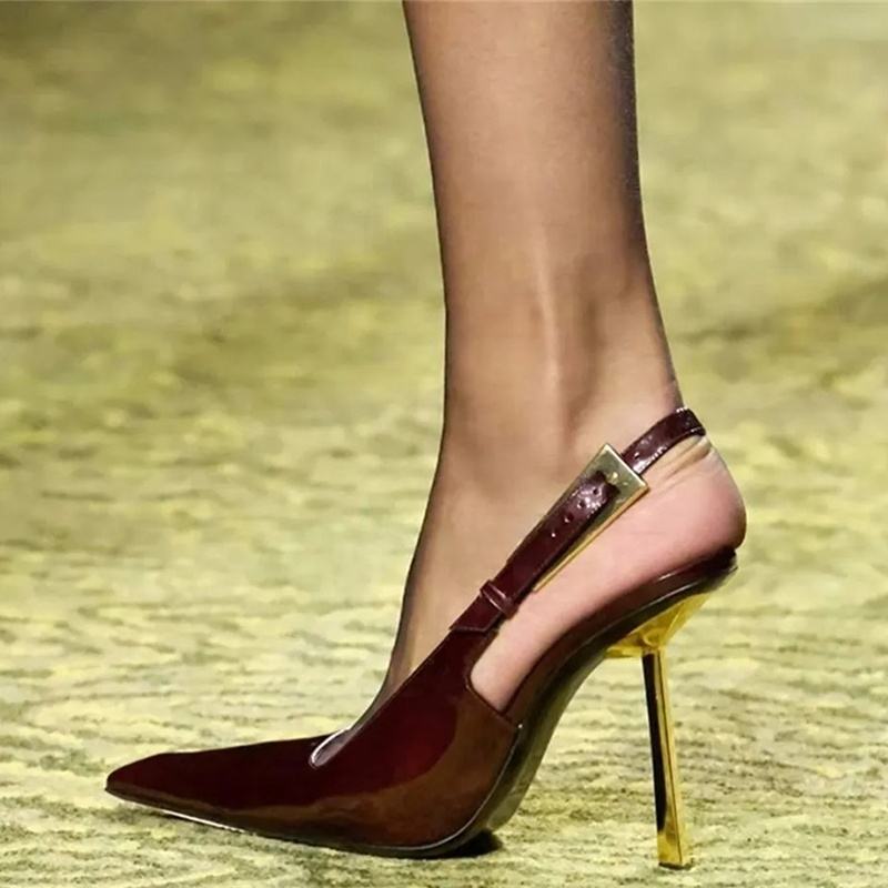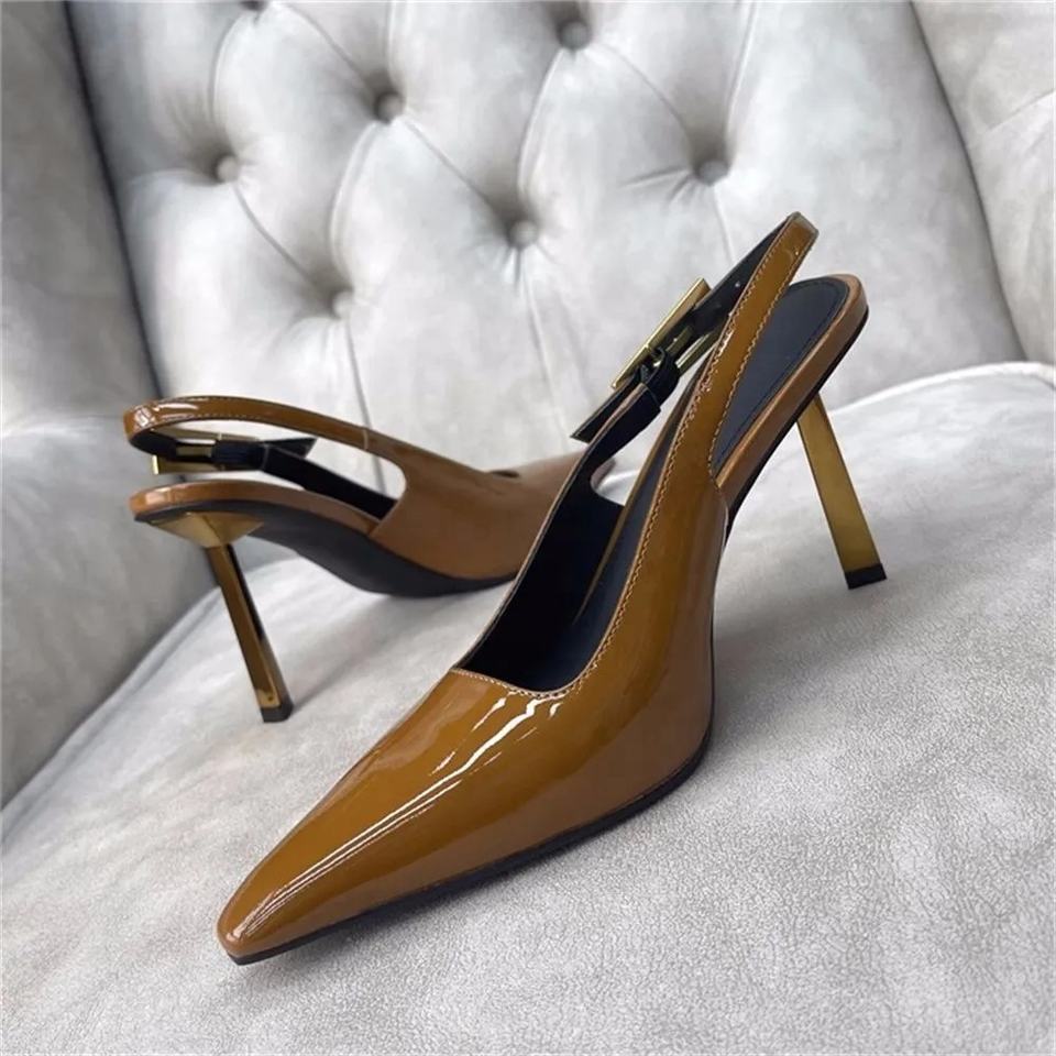 Zapatos de tacón de aguja finos de metal con hebilla y punta puntiaguda para mujer, sandalias sexys con corte lateral y tira trasera