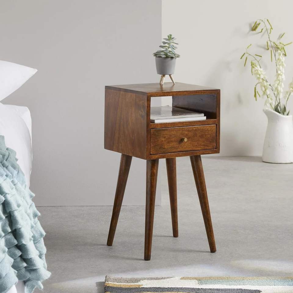 Mesa de Noche de Madera Maciza: Mesita de Noche de Diseño con 1 Cajón y 1 Estante - Mesa Auxiliar para Dormitorio