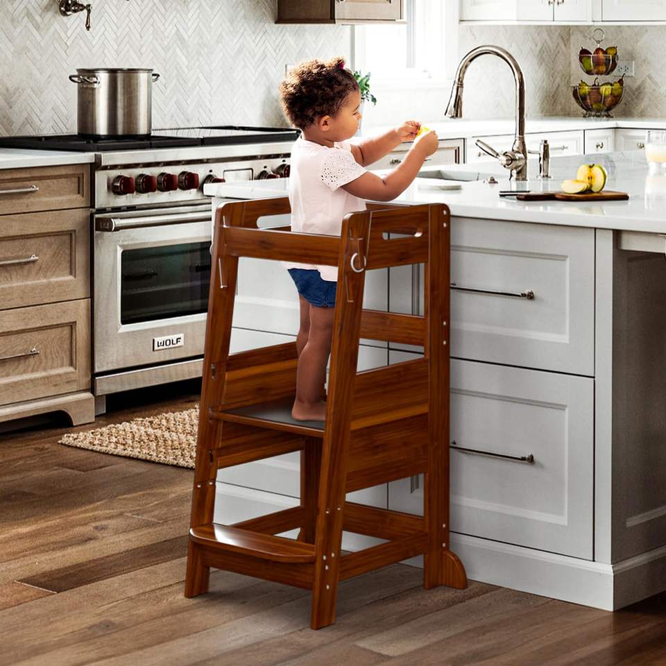 Taburete de Cocina para Niños de Madera Maciza, Torre de Aprendizaje con Altura Ajustable y Barandilla de Seguridad