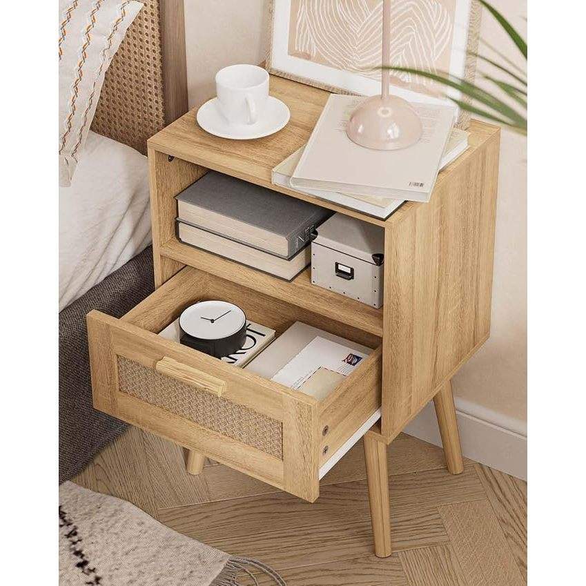 Mesita de Noche de Ratán con Patas de Madera Maciza, Estante Abierto y Cajón, para Dormitorio o Sala de Estar