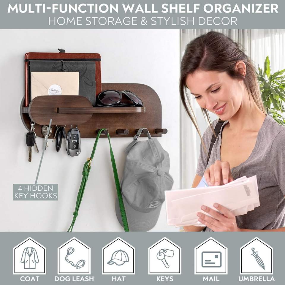 Correo de madera maciza y soporte para llaves para exhibición decorativa de pared-Incluye estante de Soporte para correo con ganchos para llaves y clavijas para colgar