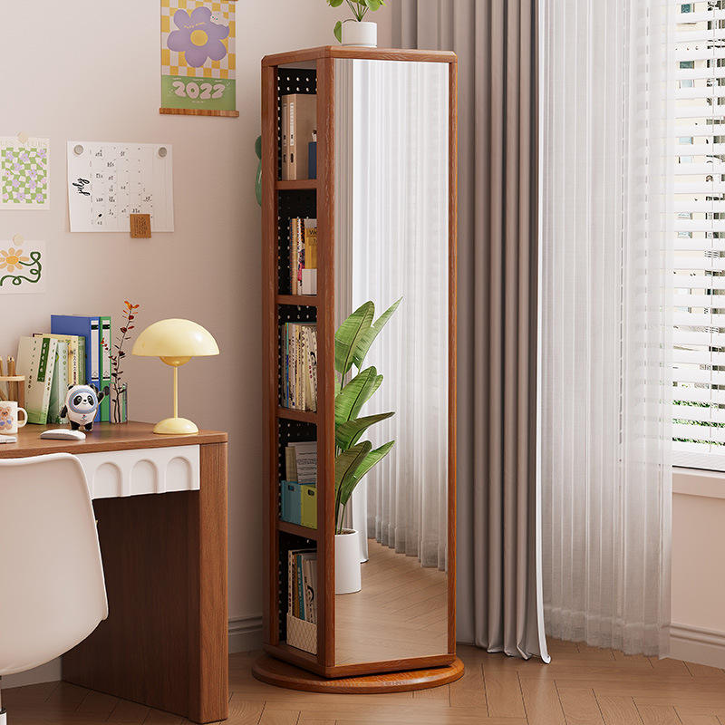 Estantería de Esquina Moderna y Sencilla de Madera Maciza con Espejo de Pie Giratorio para Sala de Estar, con Múltiples Niveles de Almacenamiento