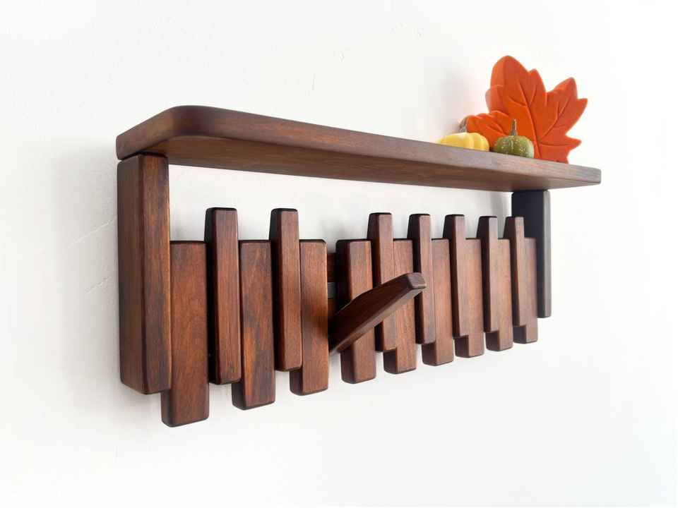 Perchero de Madera Maciza con Estante, Ganchos para Abrigos Montados en la Pared, Color Nogal, Estante Flotante Rústico para la Entrada, Decoración Otoñal