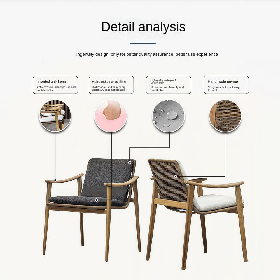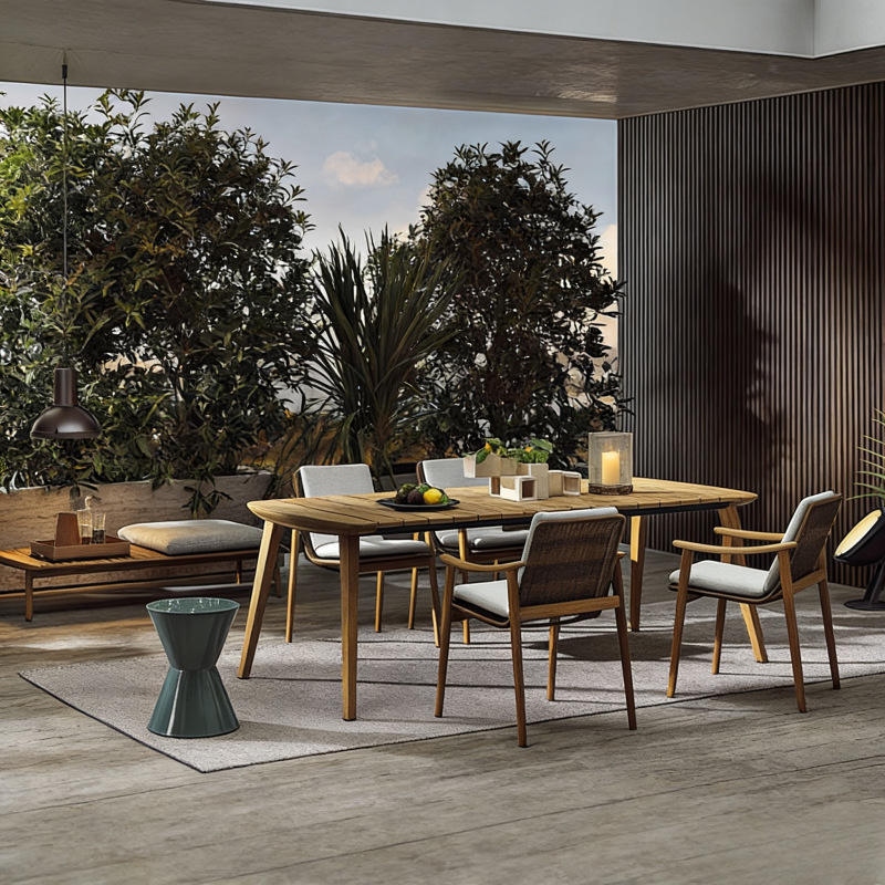 Mesa de Comedor de Madera Maciza y Ratán, Silla para Patio, Villa, Hotel, Jardín, Resistente a la Lluvia y al Sol, Muebles de Exterior, Mesa de Teca para Exteriores