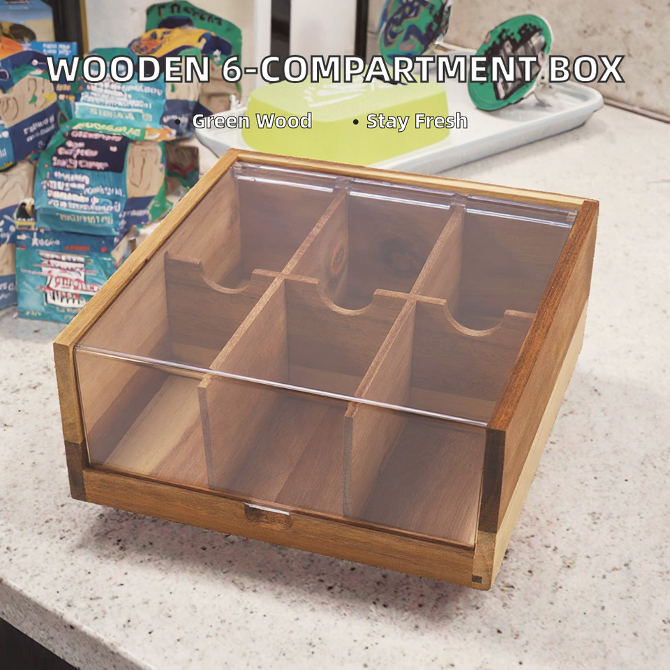 Caja de Almacenamiento de Bolsitas de Café y Té de Madera Maciza Rectangular con 6 Compartimentos, Diseño Clásico, Tapa de Aluminio, Acrílico Transparente, Apta para Alimentos