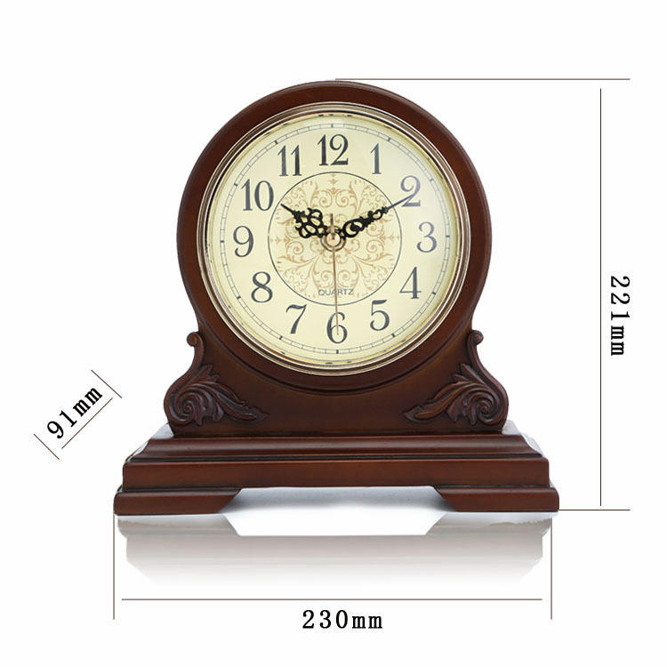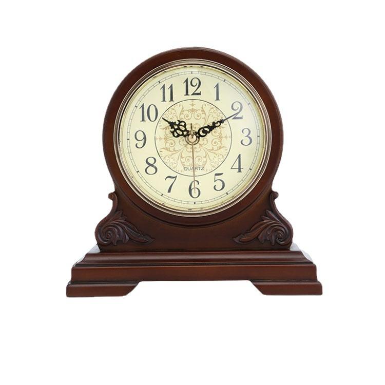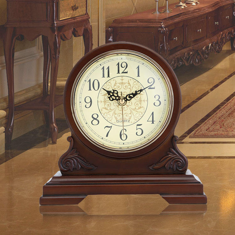 Solid Wood Table Clock Circular European Style Retro Antique Living Room Silent Quartz Clock