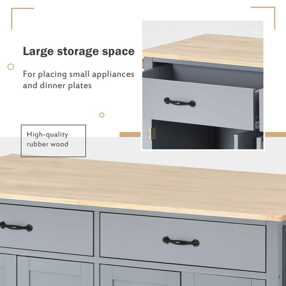 Carrito de Cocina con Cubierta de Madera Sólida de 54.3 Pulgadas, con Gabinete de 4 Puertas, Dos Cajones, Estante para Especias, Toallero y Ruedas con Bloqueo