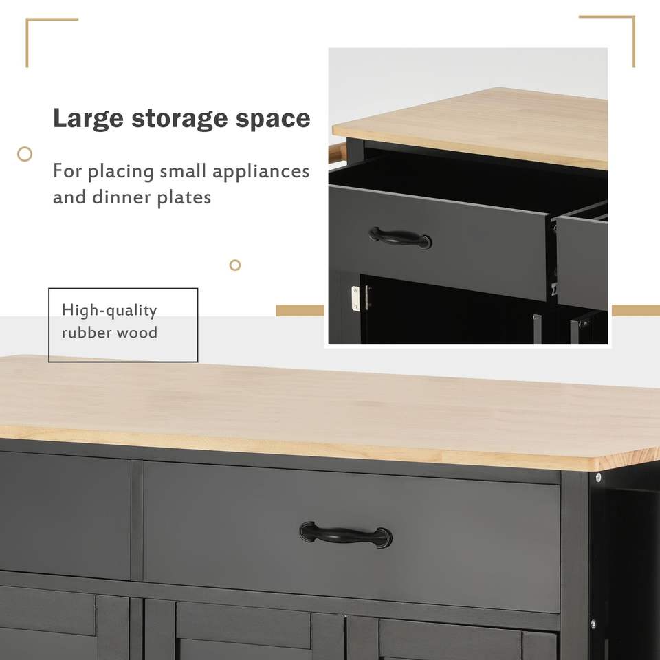 Carrito de Cocina con Cubierta de Madera Sólida de 54.3 Pulgadas, con Gabinete de 4 Puertas, Dos Cajones, Estante para Especias, Toallero y Ruedas con Bloqueo