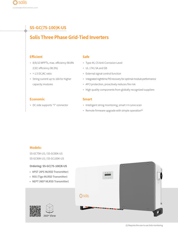 Solis Inversor de Conexión a Red para Sistemas Solares Industriales, Alta Fiabilidad, Bajo Mantenimiento, 75-100, 75kW, 100kW, 1, 1, 2, 1, 2
