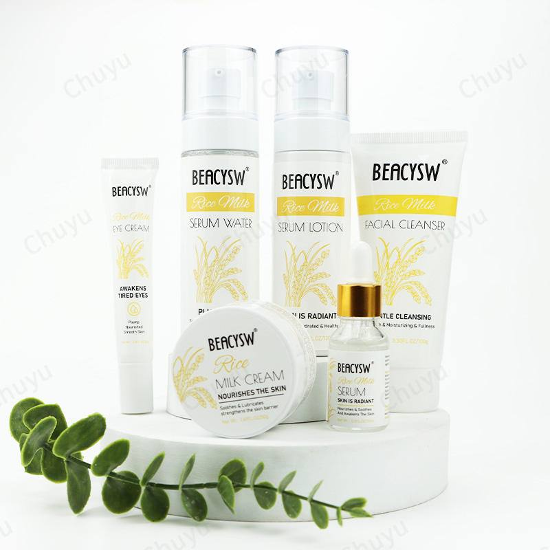 Kit de cuidado de la piel a base de arroz de reparación calmante con crema de loción de agua de suero limpiador y crema de ojos para nutrir y aclarar
