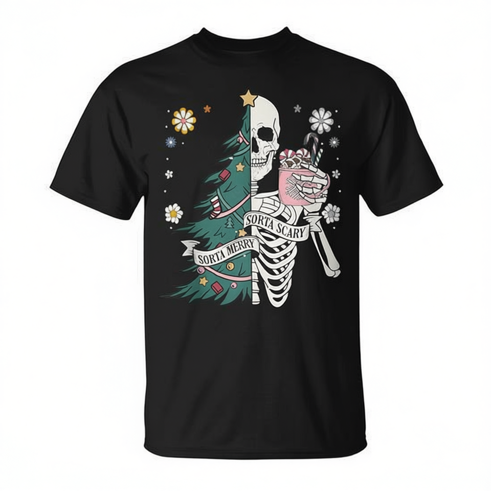 Camiseta Sorta Scary Merry Christmas Skeleton Tree, negra, talla mediana, unisex, cuello redondo, manga corta, impresión digital
