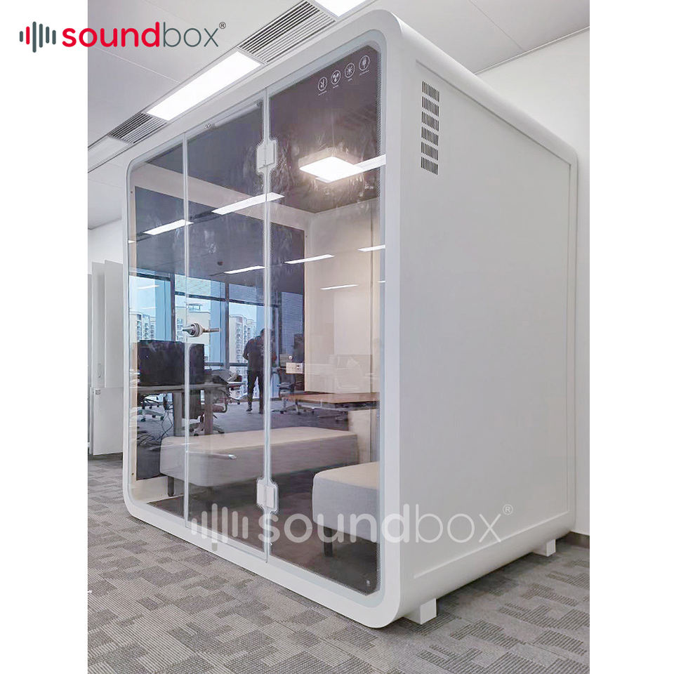 Caja de sonido móvil, silencioso, cabina de recepción de 4 asientos, cabina de oficina, puerta de vidrio interior, reducción de ruido, cápsula de reunión insonorizada