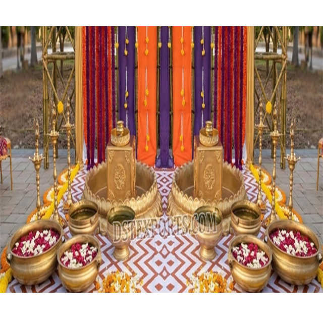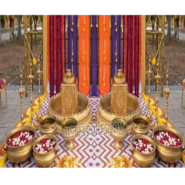 Escenario para la Ceremonia Haldi del Sur de Asia con Decoración Tradicional, Accesorios de Moda para la Ceremonia Vattna, Decoración Creativa para el Seteo de Urli