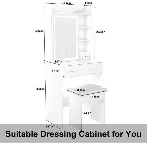 Tocador de maquillaje blanco que ahorra espacio con luces LED ajustables, incluye taburete acolchado, estante de almacenamiento oculto para dormitorios pequeños