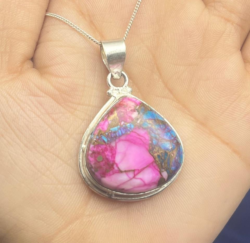 Colgante de turquesa de ostra espinosa, colgante de piedras preciosas de cobre de ostra rosa, colgante de turquesa de gota de lágrima, turquesa rosa