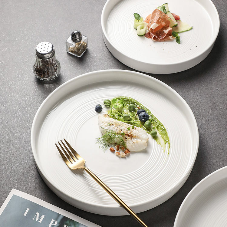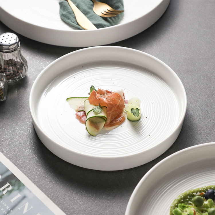 Espiral en relieve de alta calidad de forma redonda bistec ensalada pasta servir restaurante barato suministro a granel platos de cena de cerámica blanca