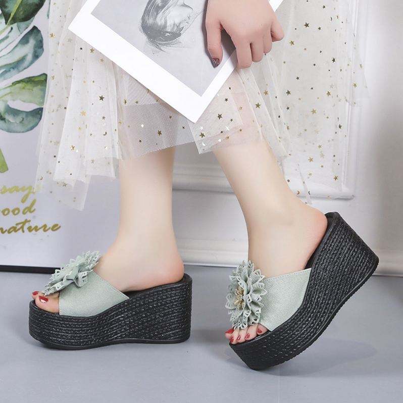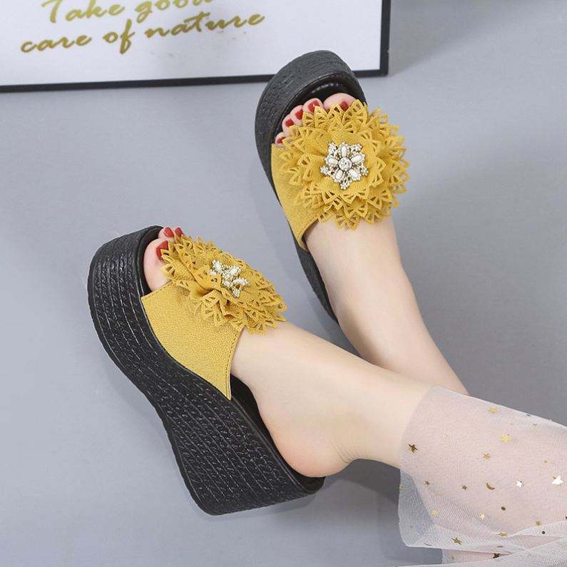 Pendiente inferior de pastel de esponja con dedos expuestos Zapatillas frescas Flor Plataforma impermeable Aumento de altura Arrastre recto