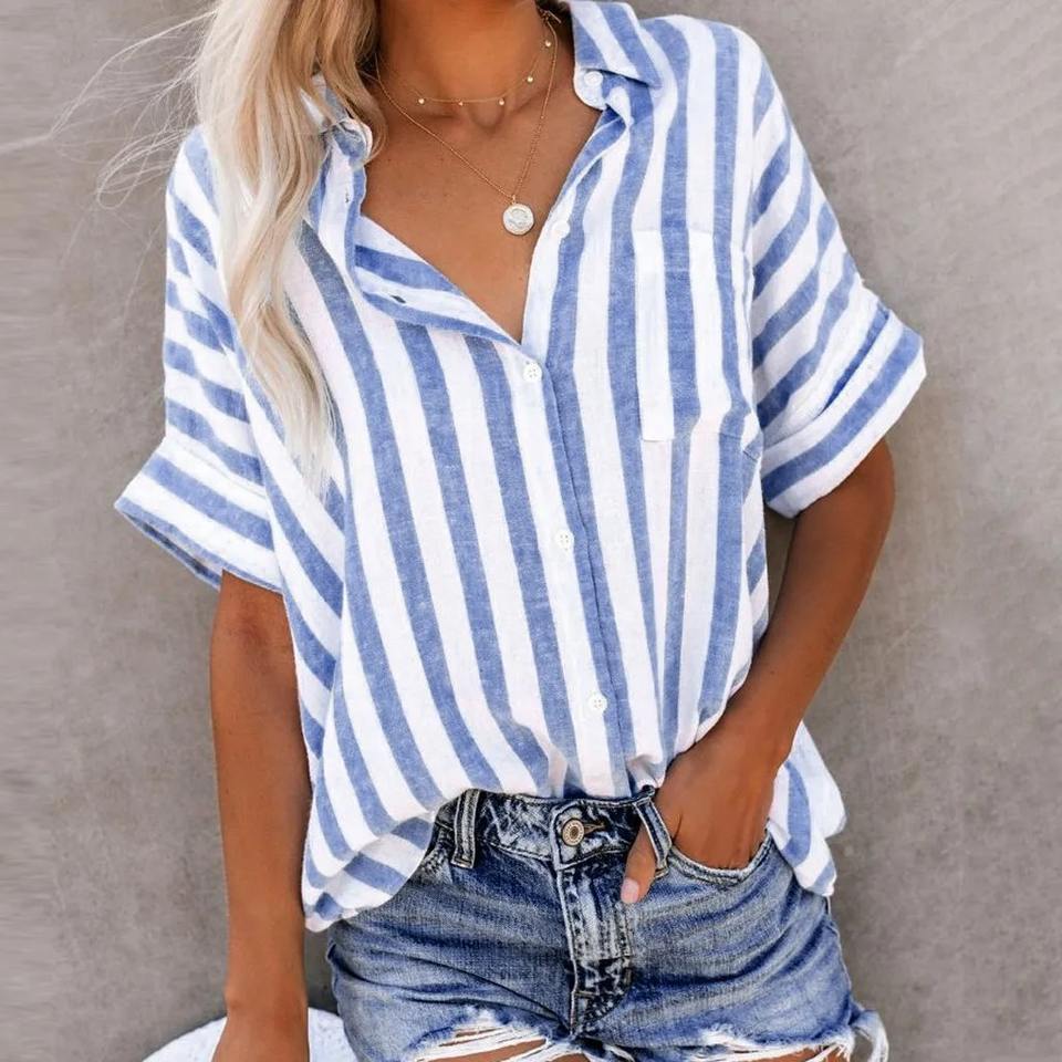 Blusa de Manga Corta con Estampado de Cuadros Vintage para Mujer, Camisa con Botones y Solapa para Primavera y Verano, para Ir al Trabajo y Fiestas Informales, con Logotipo Frontal