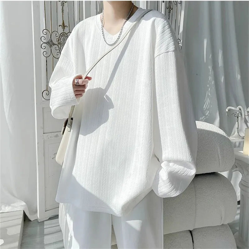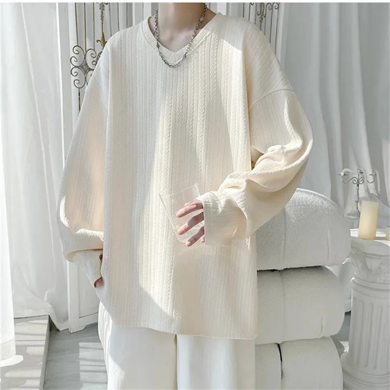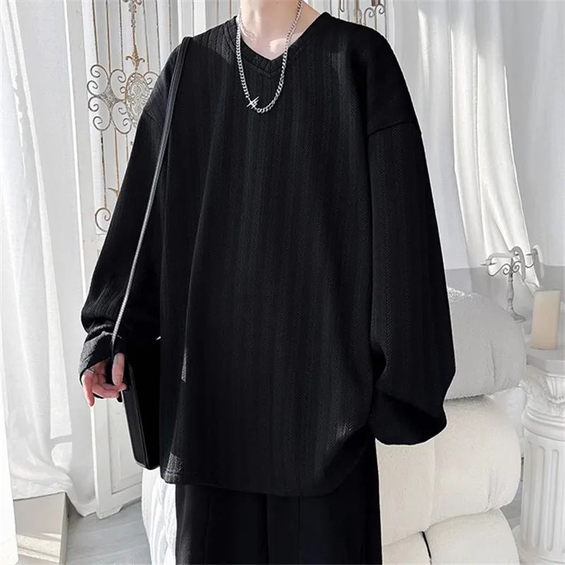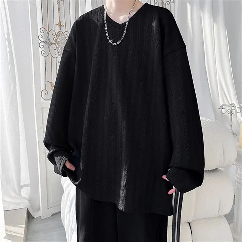 Camisetas Holgadas de Manga Larga con Cuello en V para Hombre, Primavera-Otoño, Color Sólido, Estilo Casual, Moda Urbana
