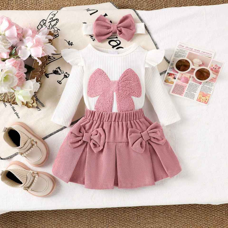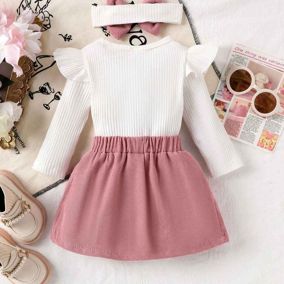 Conjunto Casual Lindo para Bebés Niñas: Pelele Blanco Acanalado de Manga Larga con Lazo y Falda Rosa para Primavera