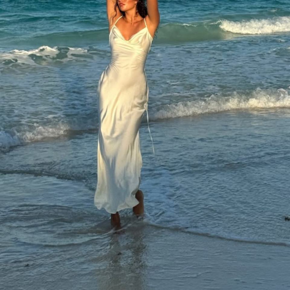 Vestido de fiesta elegante y modesto de marca personalizada para primavera, vestido sexy con espalda descubierta y escote en V profundo, vestido recto de satén para verano y playa.