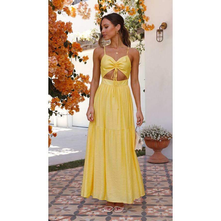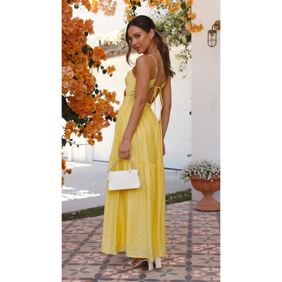 Vestido Vintage Cálido de Primavera en Amarillo con Cuello en V y Cremallera hasta el Suelo, Gran Venta