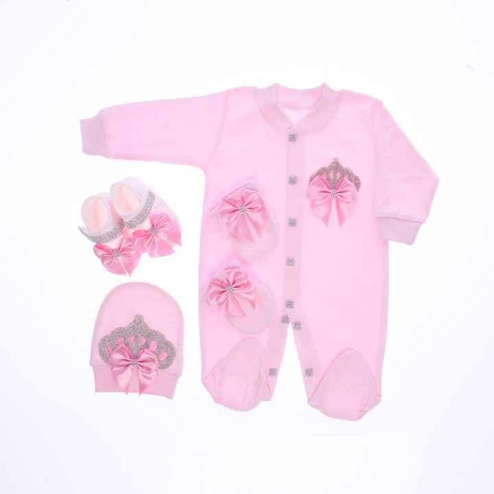 Primavera de punto Regular 4 piezas Rosa 100% algodón manga larga burbuja de bambú personalizado recién nacido bebé niña mameluco conjunto Cierre de botón
