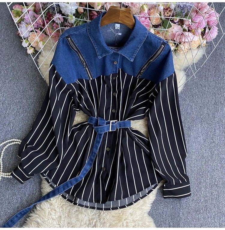 Camisa de Manga Larga con Parches de Mezclilla y Combinación de Colores, Estilo Casual de Primavera para Mujer