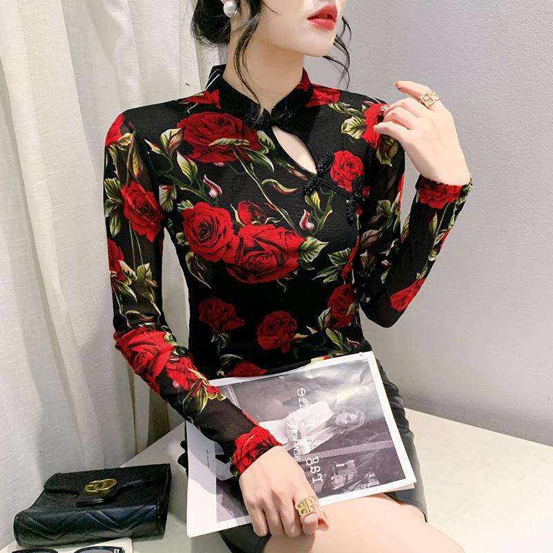 Primavera nueva camiseta de manga larga con estampado Floral de malla con diseño de boca de placa de estilo Retro adelgazante para mujer