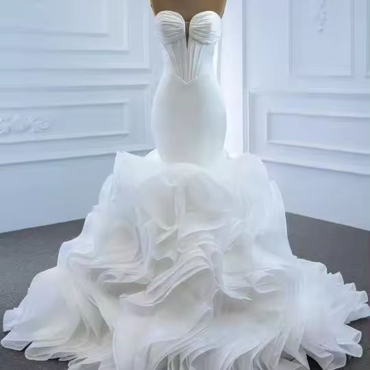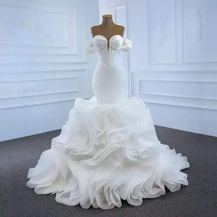 Vestido de Novia Elegante Blanco Estilo Primavera con Hombros Descubiertos, Espalda Descubierta, Ajustado, con Encaje y Cola de Sirena Ondulada, Hecho a Medida para Mujer