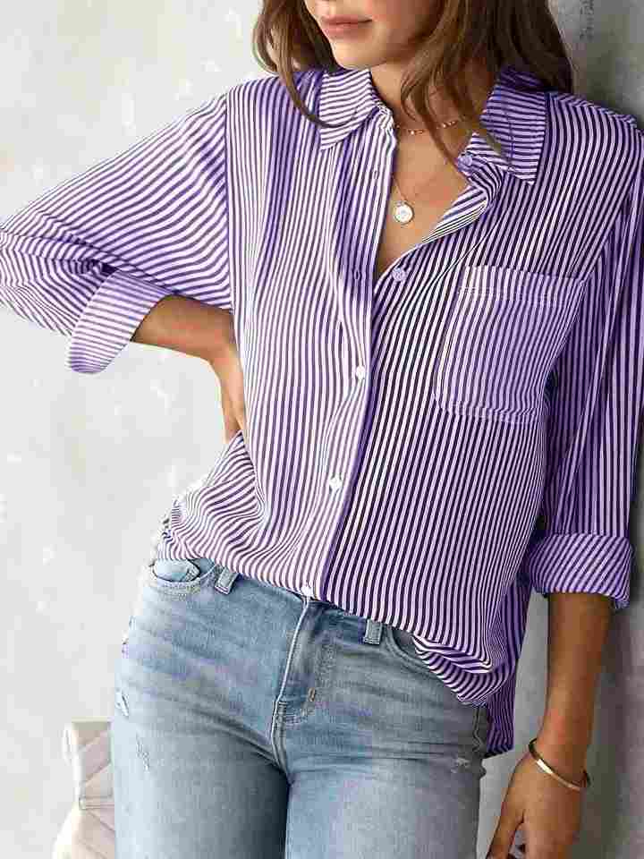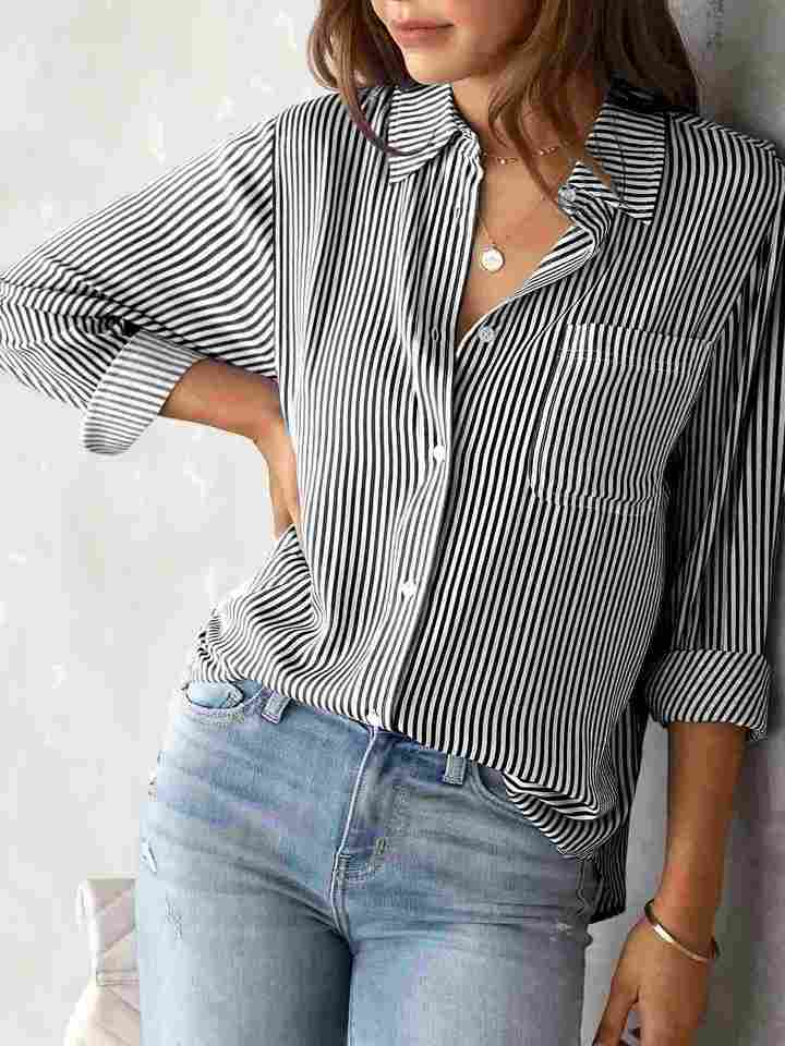 Blusa de Manga Larga con Cuello Polo y Estampado a Rayas para Mujer, Estilo Casual, Holgada, a la Moda, Combinable con Todo, Camisa Elegante Vintage para Mujer