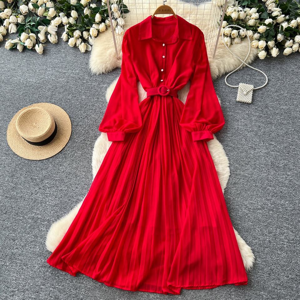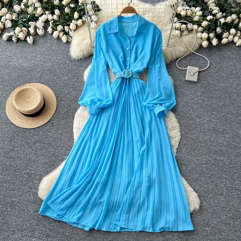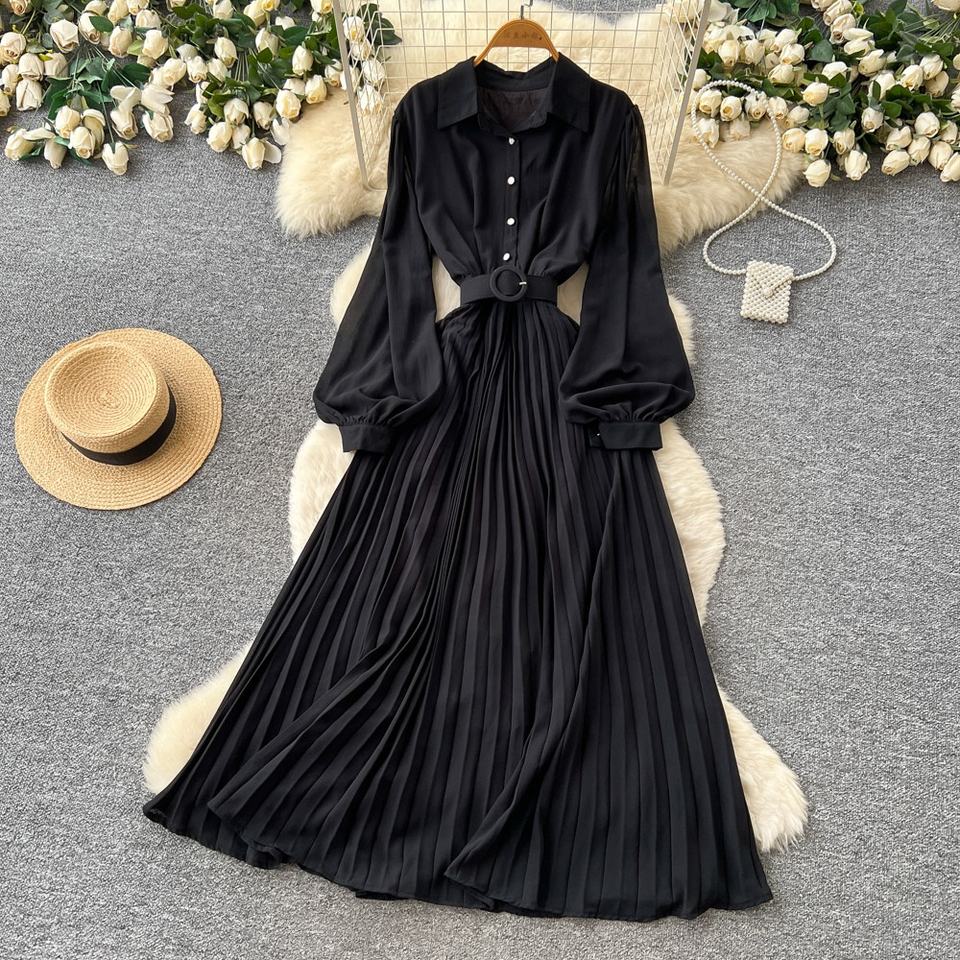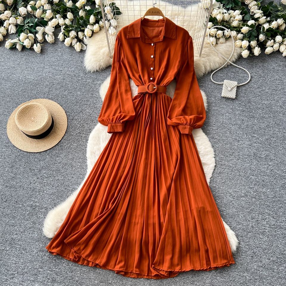 Vestido Casual de Primavera para Mujer, Cuello Camisero, Manga Larga, Color Sólido, Cintura Alta, Corte en A, Vestido Midi Elegante